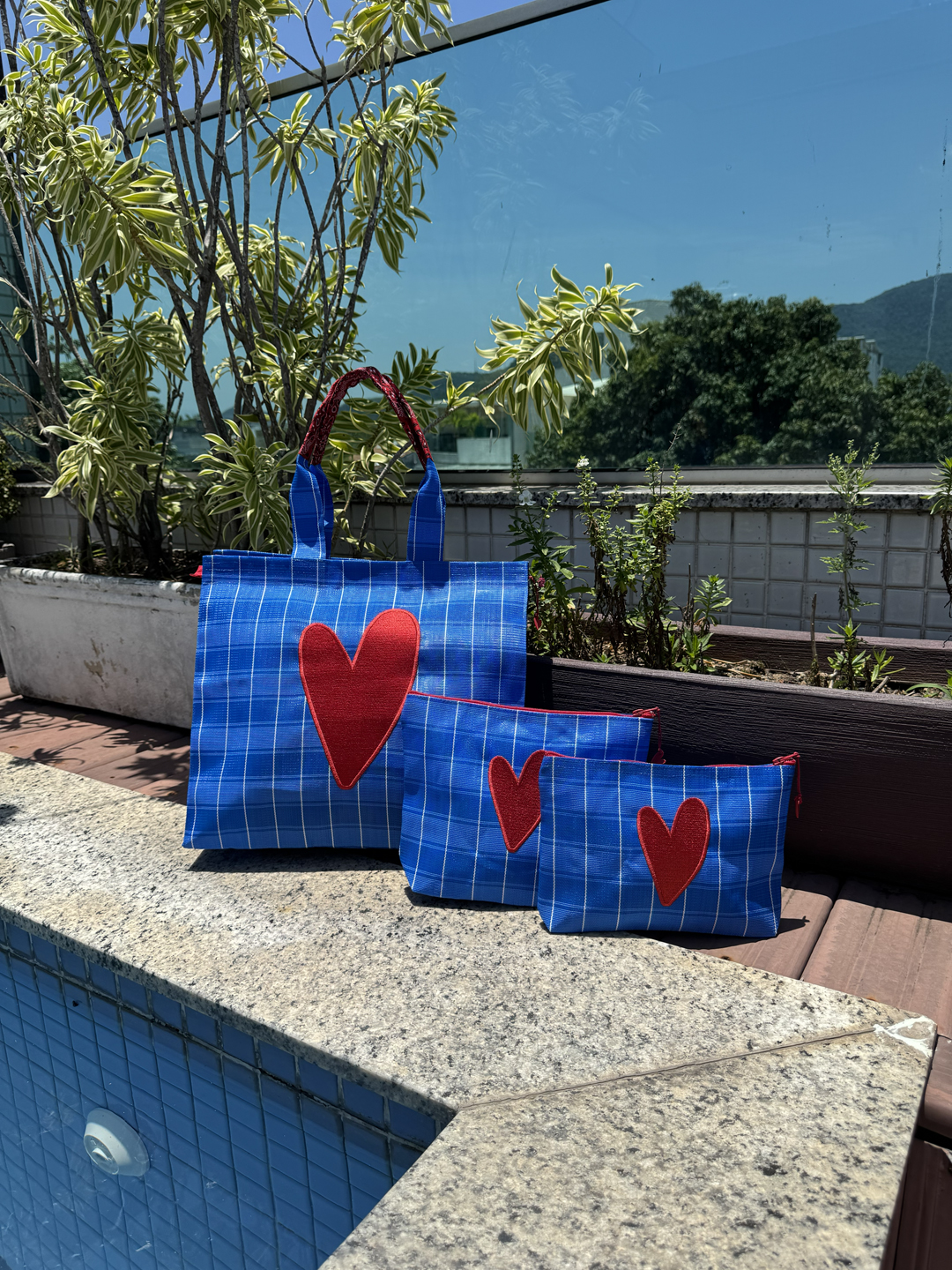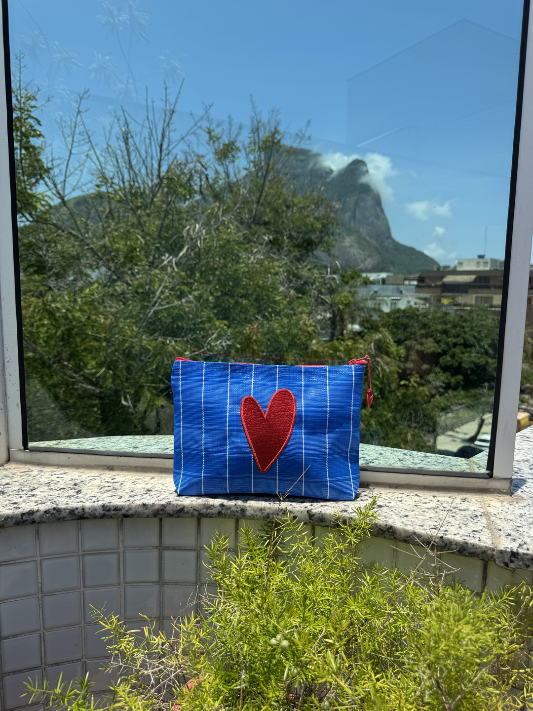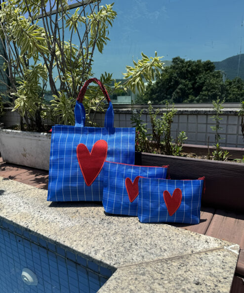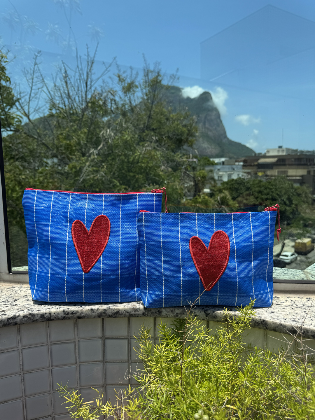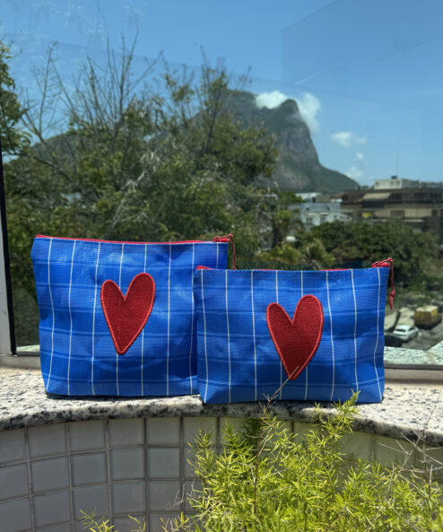 Necessaire em tela de nylon bordada com coração Dupla vermelho. Possuí ziper, é lavável e resistente.