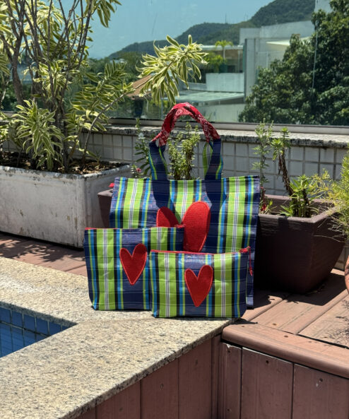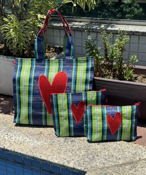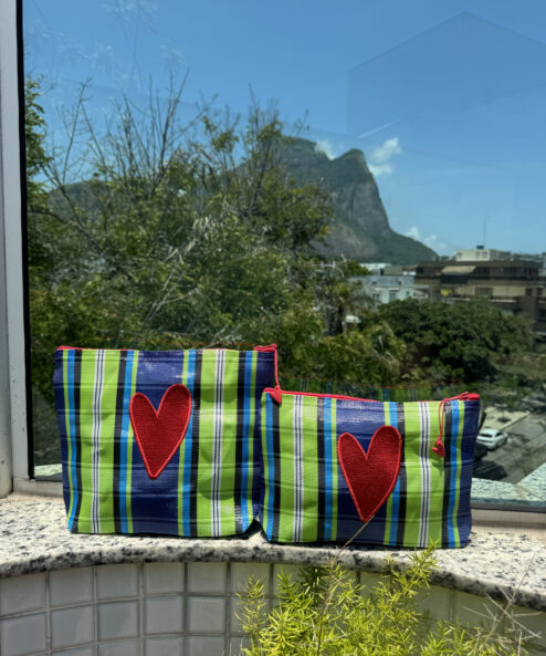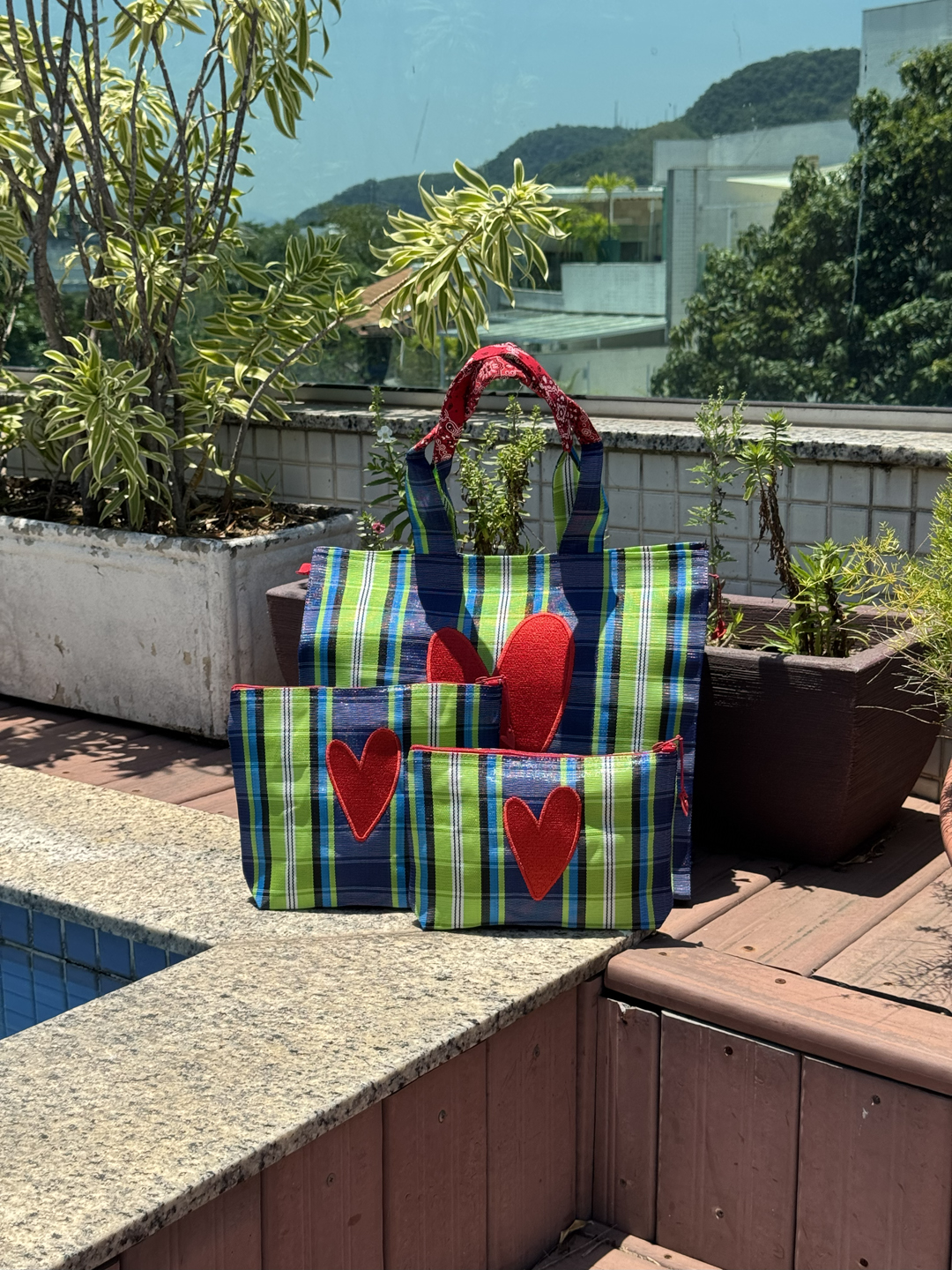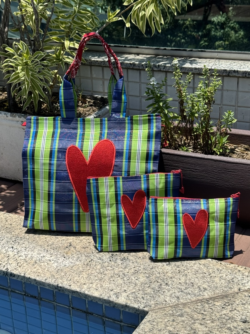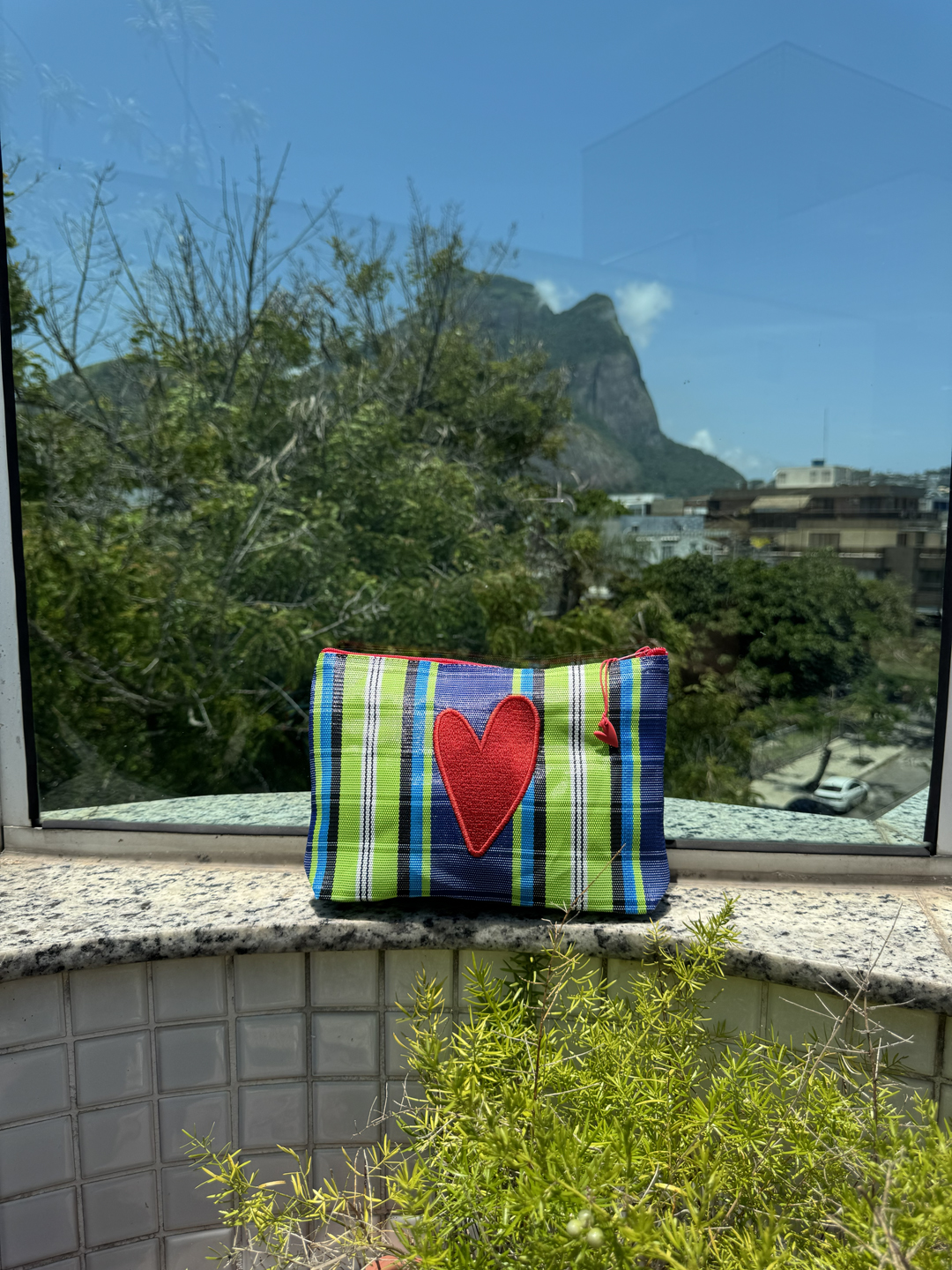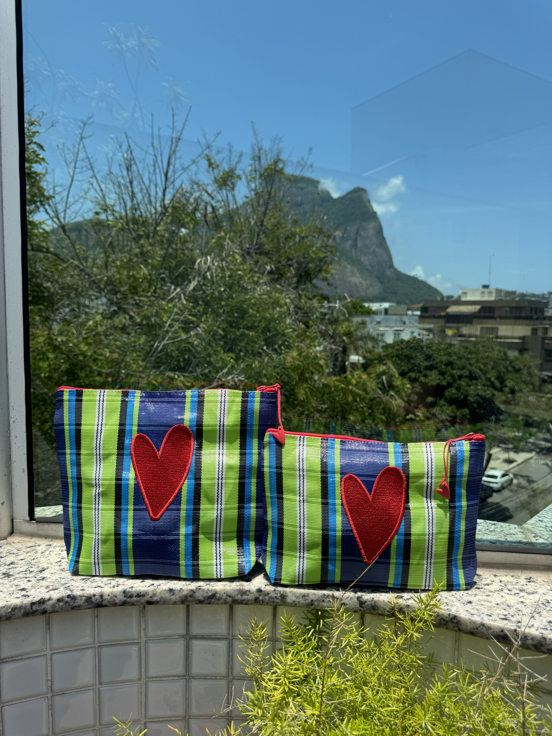 Necessaire em tela de nylon bordada com coração Dupla vermelho. Possuí ziper, é lavável e resistente.