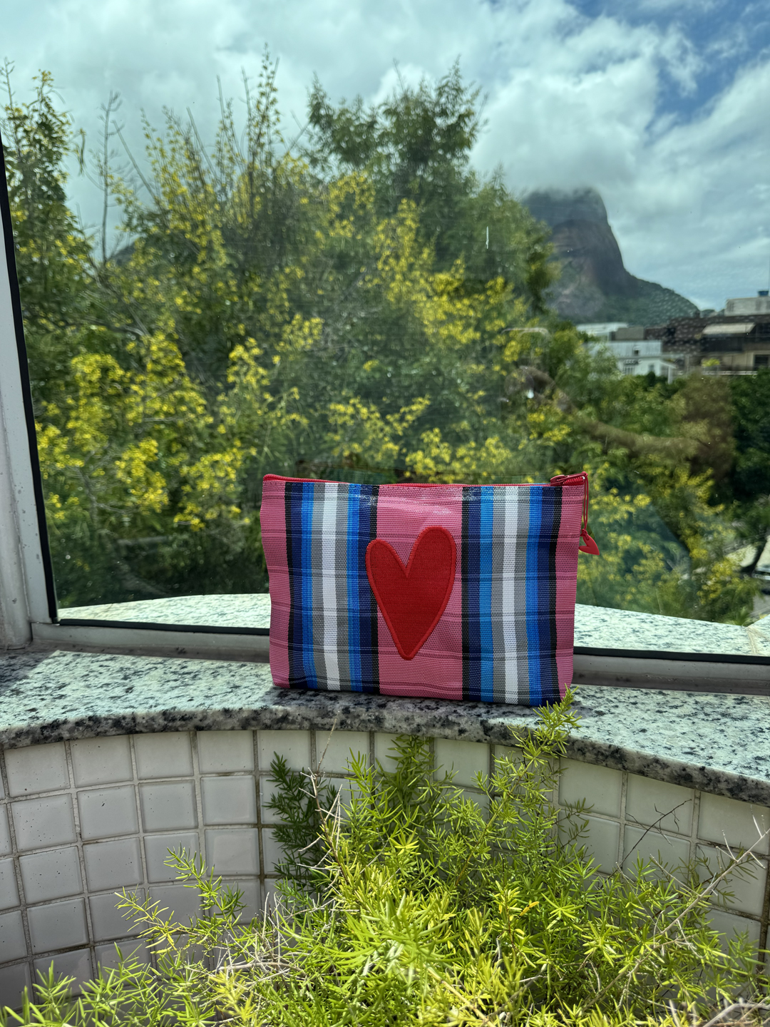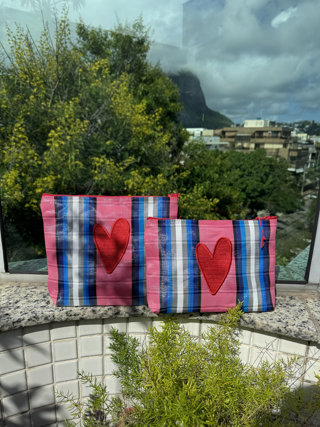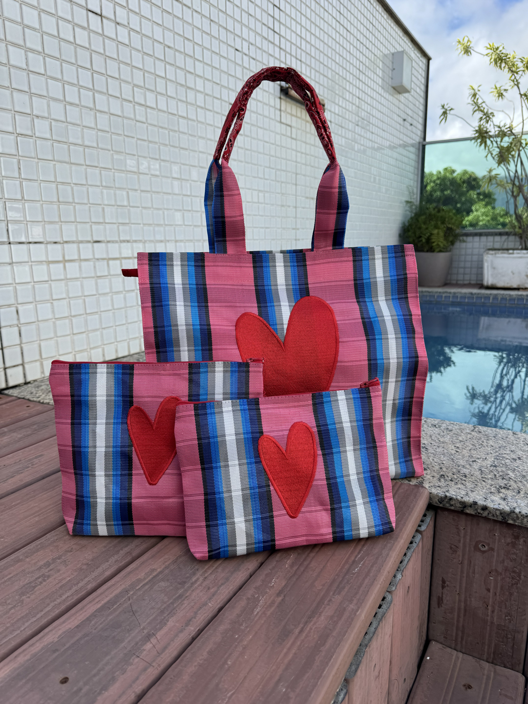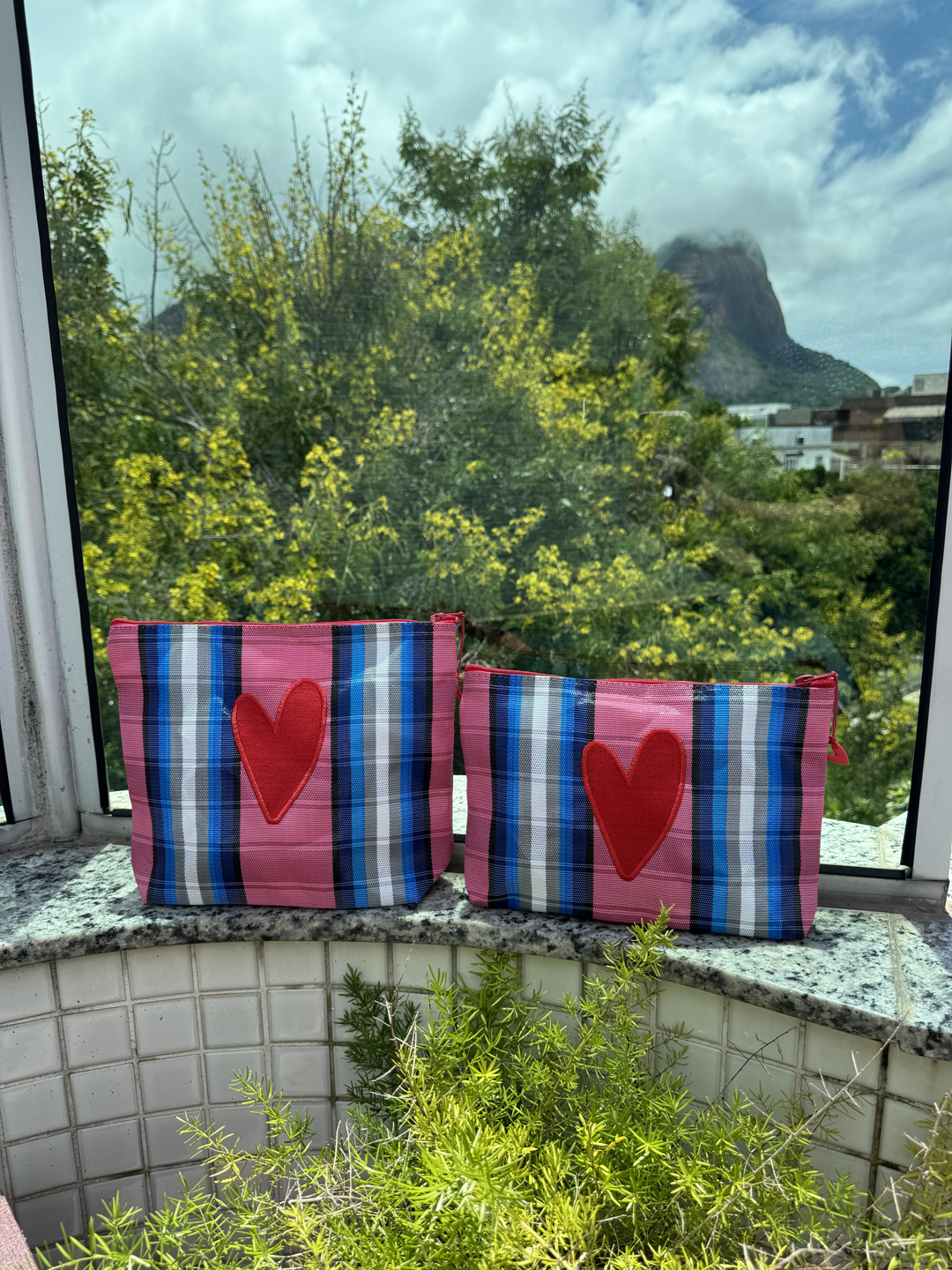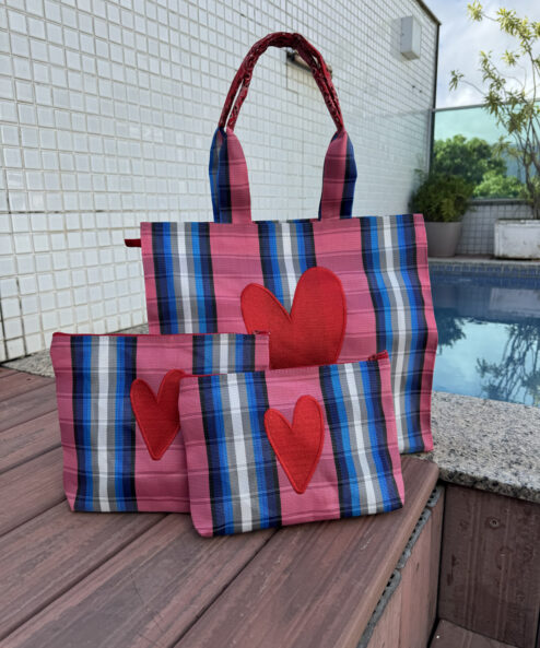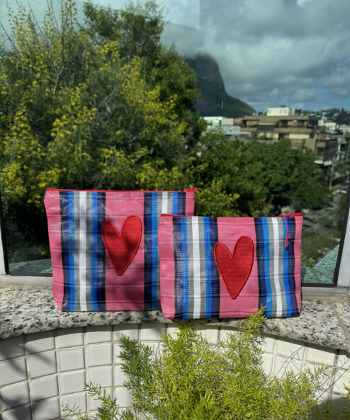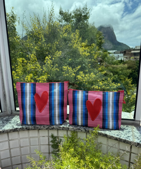 Necessaire em tela de nylon bordada com coração Dupla vermelho. Possuí ziper, é lavável e resistente.