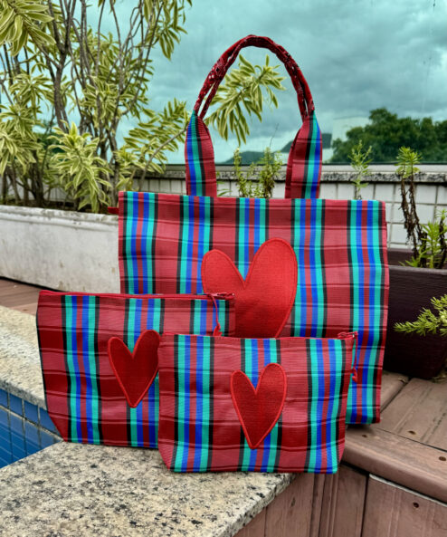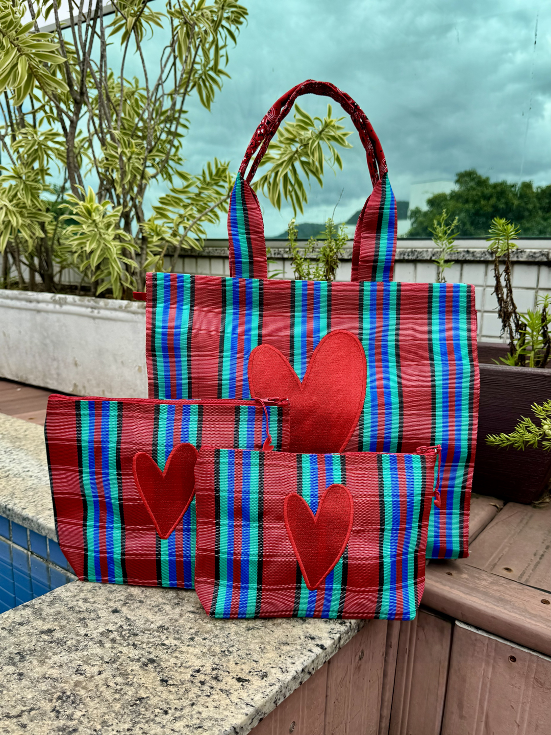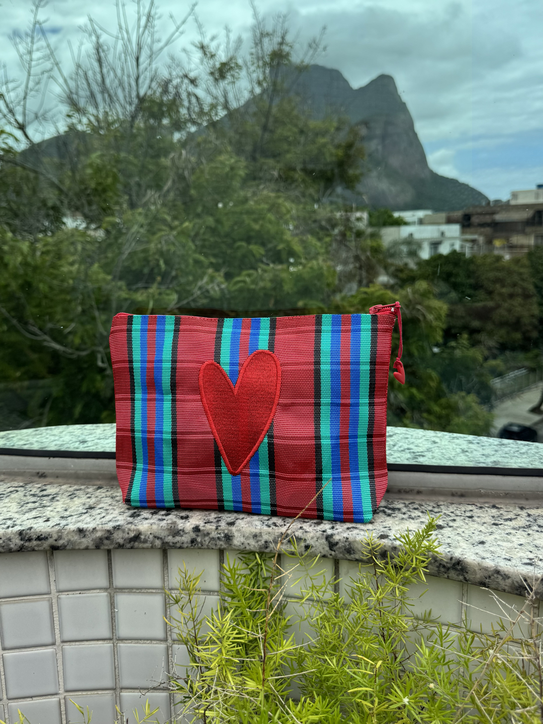 Necessaire em tela de nylon bordada com coração Dupla vermelho. Possuí ziper, é lavável e resistente.