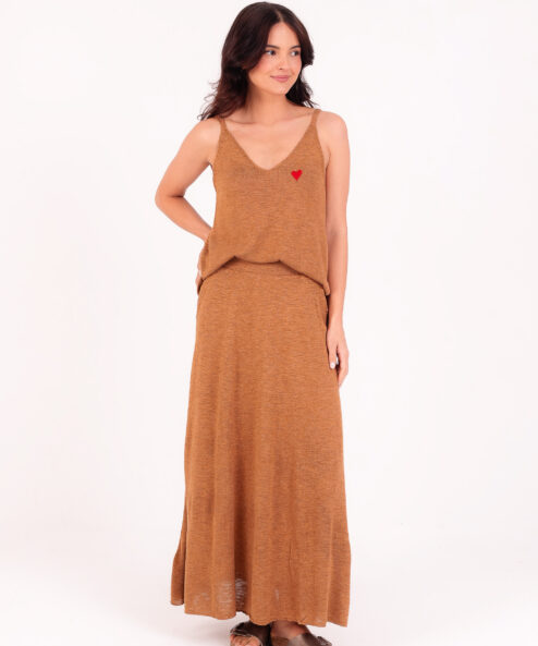 Regata em Tricot de Viscose lisa, aberturinha na lateral, e Coração em jacquard no peito. Perfeita com a nossa saia e Short no mesmo Tricot.